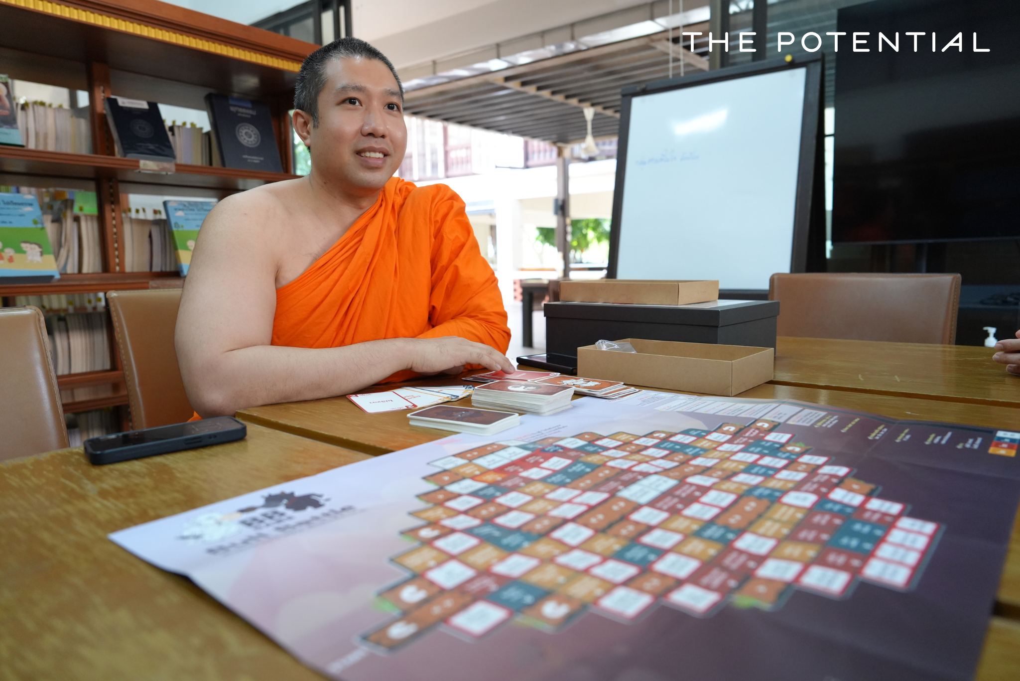 “ช่วงแรกอาตมากับทีมพระลองนำบอร์ดเกมหลายรูปแบบมาศึกษากลไก ค่อยๆ เรียนรู้ร่วมกัน หยิบองค์ประกอบจากเกมนั้นมาผสมอันนี้ ใช้เวลาประมาณครึ่งปี กว่าจะค่อยๆ ตกผลึกออกมาเป็น ‘บอร์ดเกมภาวนา’ โดยมีธรรมะเป็นโครงพื้นฐานของทุกเกม”