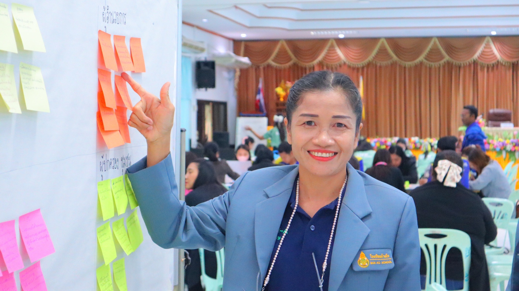 “ในส่วนของกิจกรรมหน้าเสาธง โรงเรียนบ้านโกเปลี่ยนจากการยืนอบรมมาเป็นการนั่งล้อมวงคุยกันในห้องเรียนแทน เพื่อให้คุณครูได้ใกล้ชิดกับเด็ก ได้รับฟังเด็กมากขึ้น แล้วการเข้าแถวของเราก็คือเข้าแถวรวมกับพี่ประถม ก็จะทำให้เขารู้สึกว่าเป็นส่วนหนึ่ง เป็นนักเรียนคนหนึ่งในโรงเรียนบ้านโก ที่ไม่ใช่แค่เด็กอนุบาลเท่านั้น แล้วก็ยังมีกิจกรรมน้องไหว้พี่ พี่รับไหว้น้อง ซึ่งเป็นการฝึกในเรื่องของการเคารพซึ่งกันและกัน”